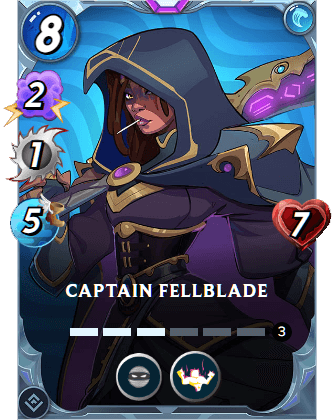 Captain Fellblade é uma carta rara do Splinter Água, introduzida na edição "Rebellion". Suas habilidades o tornam ideal para estratégias que combinam pressão ofensiva e suporte defensivo: