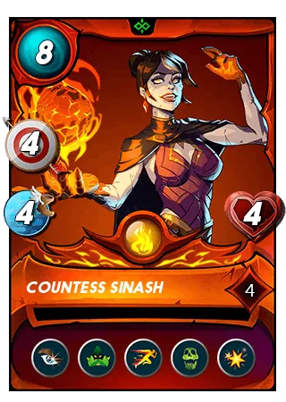 Para última posição, “Countess Sinash” Além de possui a habilidade de ataque sempre no que possui menor saúde, ainda possui habilidade “blast” que permite atacar em várias regiões do baralho adversário, além de algumas ocasiões dificultar a recuperação da saúde das cartas adversarias e só virar alva na primeira posição.